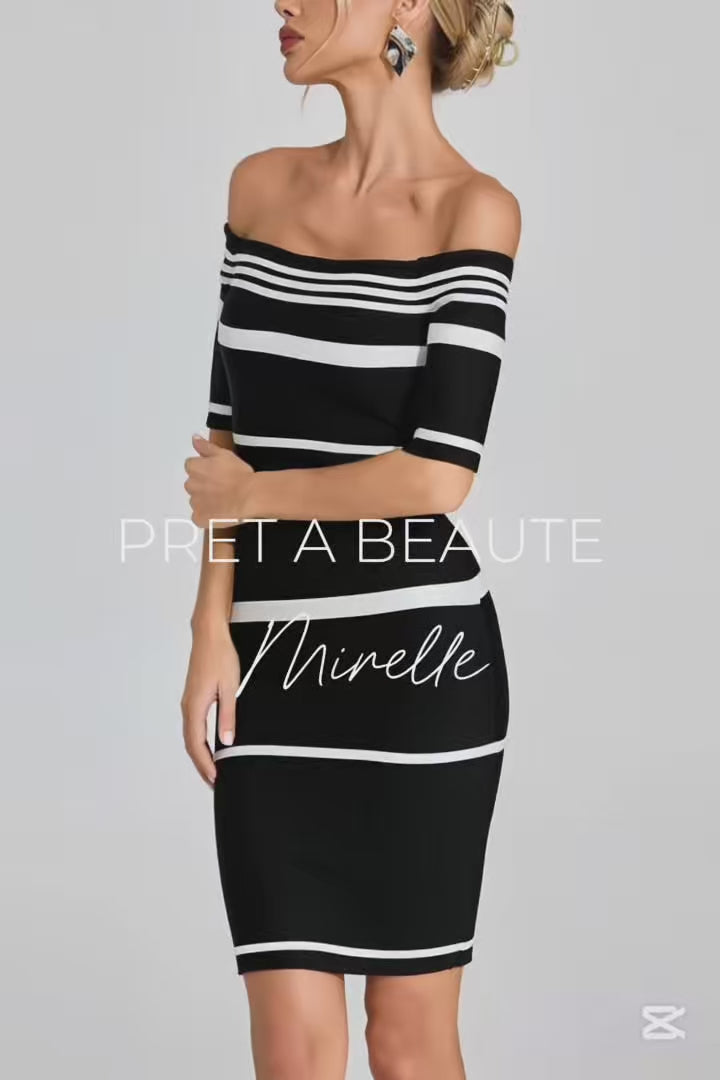 The Mirelle dress stands out for its modern and feminine silhouette. It features an off-shoulder neckline, short sleeves, a fitted bandage construction, and black-and-white stripes that create a strong contrast while flattering the figure. A discreet back zip ensures a sleek fit, while the mini length adds both confidence and elegance.