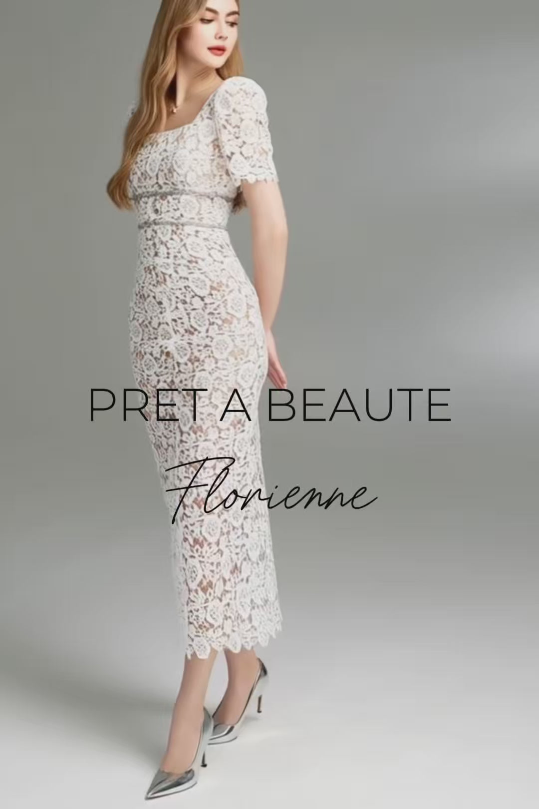 The Florienne dress embodies timeless elegance through intricate white lace and a clean, feminine silhouette. Its midi length and square neckline create a refined shape that merges romantic detailing with modern simplicity. With delicate short sleeves and a defined waist, the dress conveys a sophistication that feels both classic and contemporary.
