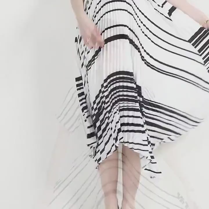 An airy dress for all occasions. The Addisin dress has a round neckline, short sleeves and an asymmetrical hem. The white background is highlighted by thin black stripes, creating an elegant contrast. It has an elastic waist for a better fit.