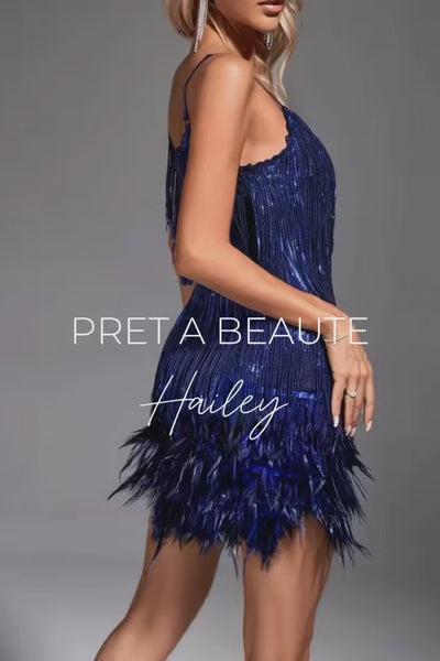 Gorgeous delicate, pink, off-the-shoulder dress. The Hailey dress features thin straps and is decorated with sequin tassels and treamed with feathers at the hem. Its charming light shines between movement and stillness, making you stand out at any event. Pair with stilettos and a mini bag for an unforgettable look. Consult the size chart below for proper size selection.