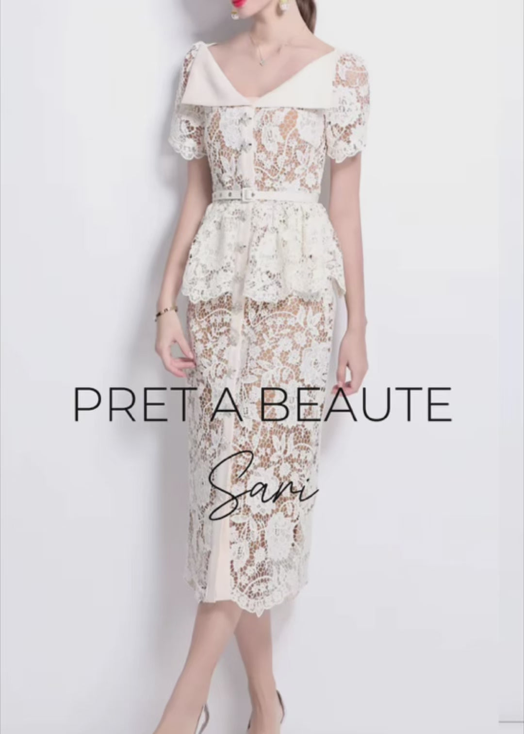 Particularly impressive dress with floral lace in ivory color. The Sari dress features a V-neckline and short sleeves made of translucent lace. Wear it and impress. Please consult the size chart for correct size selection. It can also be worn as a wedding dress.